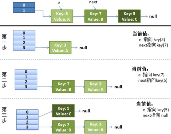 e.next = newTable[i] 导致 key(3).next 指向了 key(7)