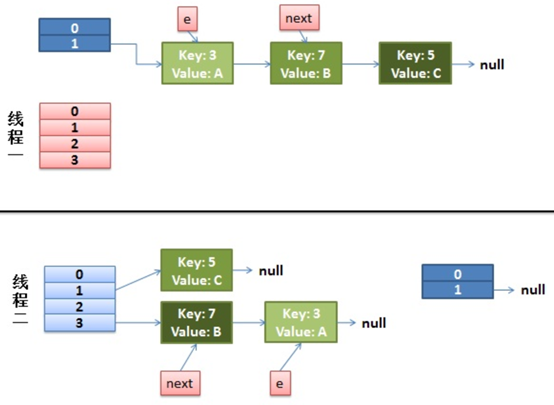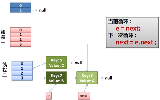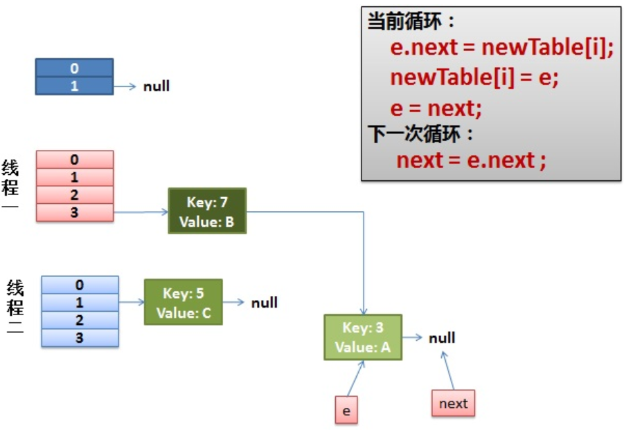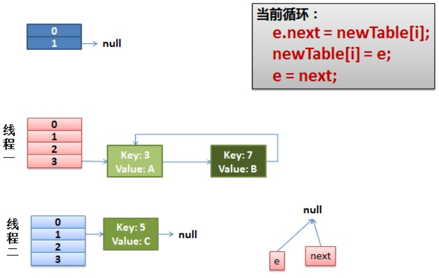 我们再回头看一下我们的 transfer代码中的这个细节:do { Entry next = e.next; // <--假设线程一执行到这里就被调度挂起了 int i = indexFor(e.hash, newCapacity); e.next = newTable[i]; newTable[i] = e; e = next;} while (e != null);而我们的线程二执行完成了。于是我们有下面的这个样子。
